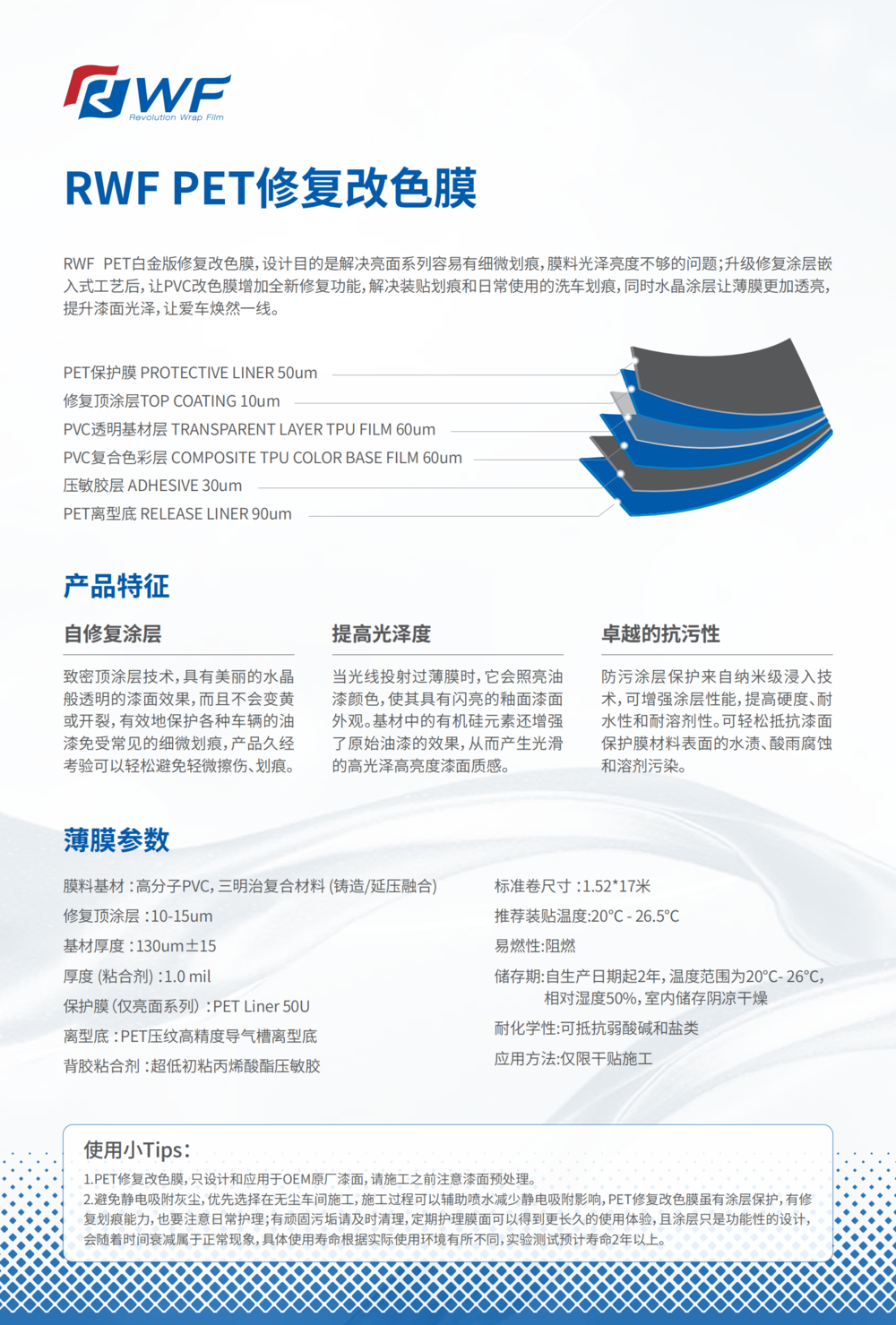 PET修复改色膜虽有涂层保护,有一定修复划痕能力,也要日常注意使用环境和护理,有顽固污垢请及时清理和定期护理膜面可以得到更长久的使用体验。